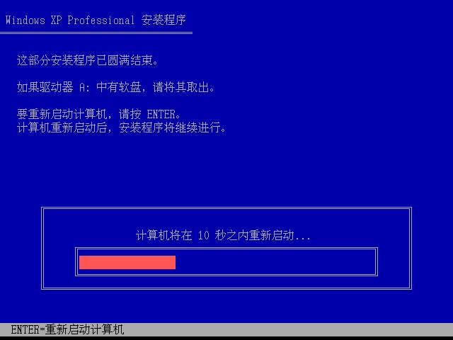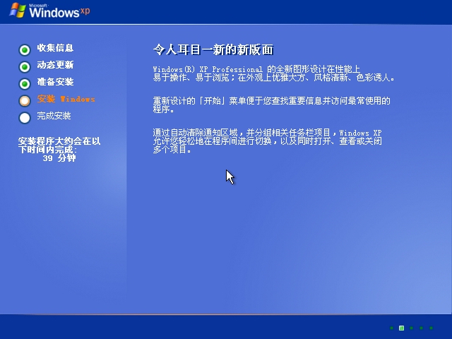 出现Windows XP Professional安装窗口,系统继续安装程序。(见下图)