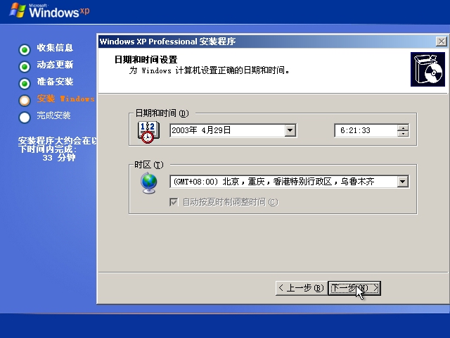 请较正当前的日期/时间/时区,并点击下一步(N)继续,安装程序将进行网络设置,安装Windows XP Professional组件,此过程将持续10-30分钟。(见下图)