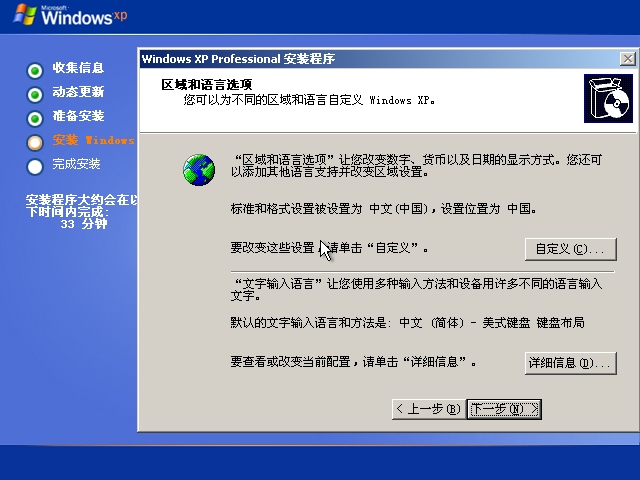安装程序将检测和安装设备,在这个过程中,将出现区域和语言选项窗口。(见下图)