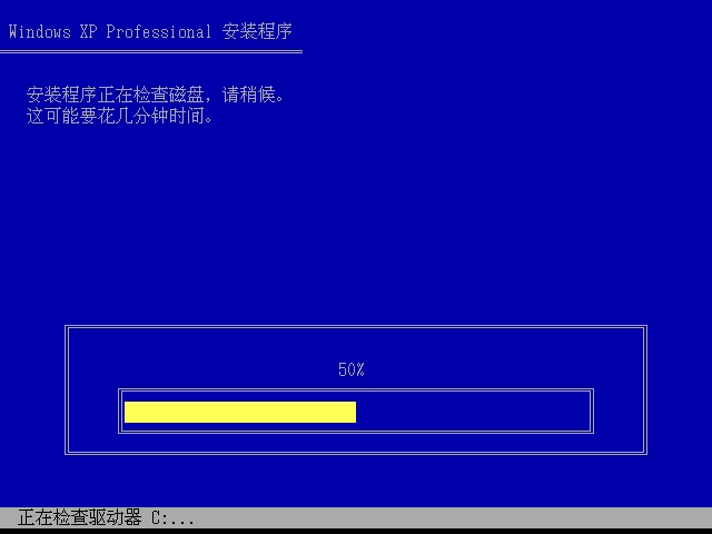 如果您已格式化好了硬盘上您所选的分区,则选择最后一项保持现有文件系统(无变化), 按回车(Enter)键后,安装程序将检测硬盘,如果硬盘通过检测,安装程序将从重新安装光盘复制文件到硬盘上,此过程大概持续10-20分钟(如下图所示)。复制文件后出现重新启动计算机的提示。