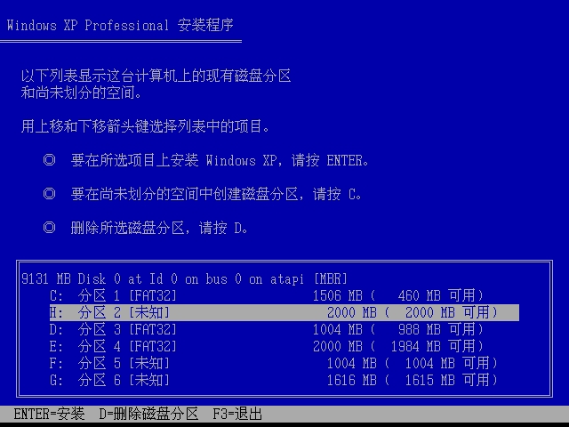 (注 未经分区的空间将显示为未划分的空间(如上图所示),如果您想对这些空间进行分区,请选择未划分的空间,按C键继续,并选择用NTFS文件系统格式化磁盘分区或用FAT文件系统格式化磁盘分区,我一般选择用NTFS文件系统格式化磁盘分区(快)按回车键继续。)