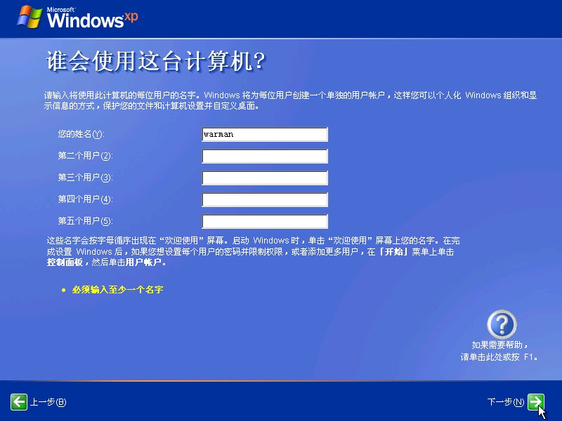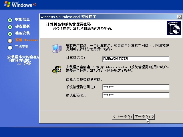 请输入您的姓名和单位,如果您是家庭用户,单位(D)栏可以空缺,单击下一步(N)继续,出现计算机名和系统管理员密码窗口。(见下图)