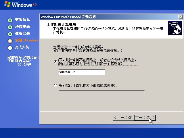 在这个设置框中有两个选项,如果您确定需要特殊的网络配置,您可以选择自定义设置(C)选项进行设置,默认情况下建议您选择典型设置(T)选项,点击下一步(N)按钮后出现工作组或计算机域窗口。(见下图)
