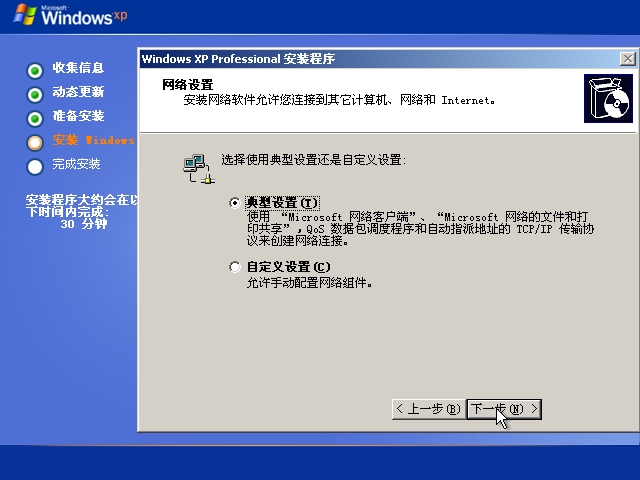 请较正当前的日期/时间/时区,并点击下一步(N)继续,安装程序将进行网络设置,安装Windows XP Professional组件,此过程将持续10-30分钟。(见下图)