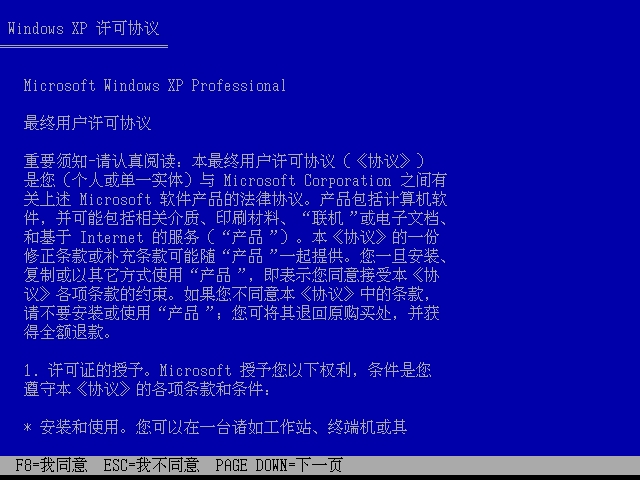 请仔细阅读Windows XP Professional许可协议。(注 按PageDown键可往下翻页,按PageUp键可往上翻页。)如果您不同意该协议,请按ESC键退出安装。如果您同意该协议,请按F8键继续,出现显示硬盘分区信息的界面(见下图)。