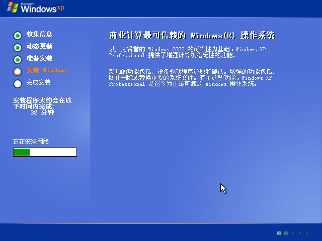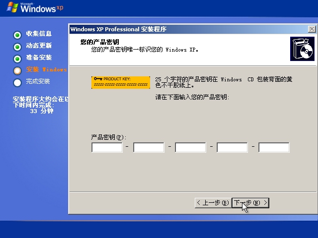 出现Windows XP Professional安装窗口,系统继续安装程序。(见下图)