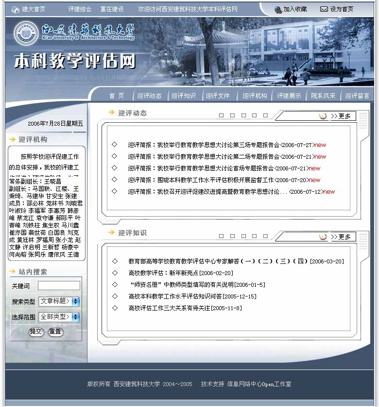 西安建筑科技大学本科评估网站:我此网站中主要承担程序维护,此网站采用php+mysql数据库,实现了动态维护等功能。